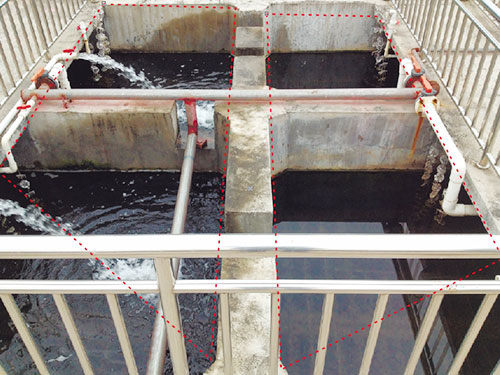 的溶解氧,以达到生化处理的目的。好氧池空气由风机提供,池内采用新型半软性生物填料,该填料表面积比大,使用寿命长,易挂膜,耐腐蚀,池底采用微孔曝气器,使溶解氧的转移率高,同时有重量轻,不老化,不易堵