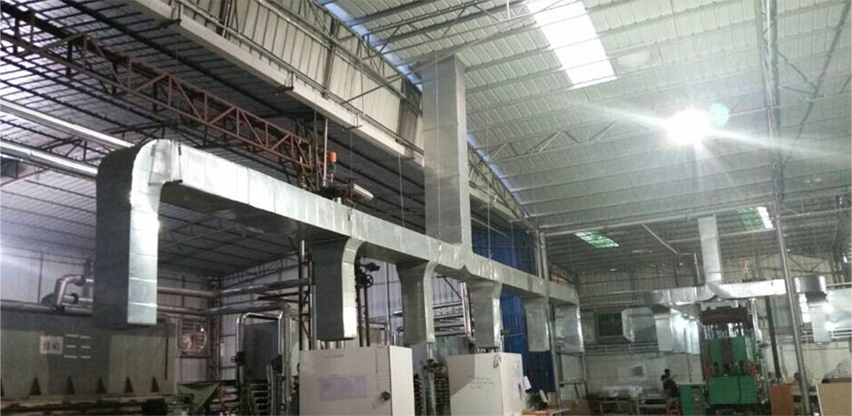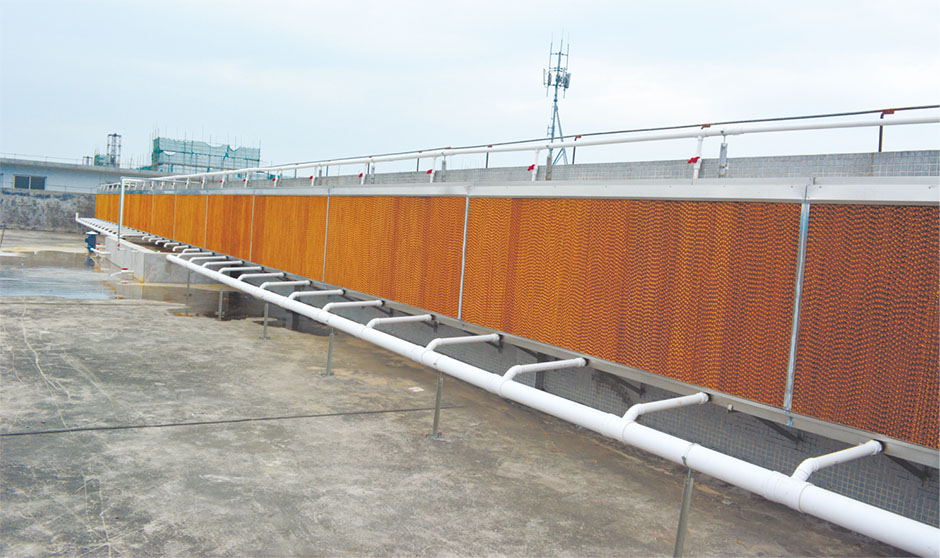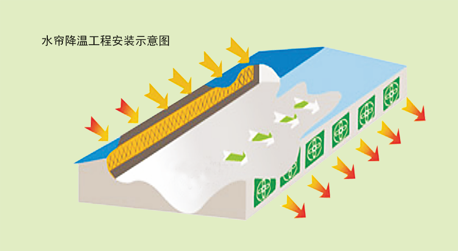水帘降温工程由负压风机和水帘墙两大部分构成,降温区域一面安装负压风机,另外一面安装水帘循环系统。循环水泵不间断地把水箱内的水提升,并通过布水系统均匀地喷淋在蒸发过滤层上,(湿帘即多层波纹纤维叠合物),保持湿帘一直湿润。当对面负压风机开启时使室内产生负压,迫使空气从水帘一面进入,在经过水帘的时候由于水蒸发吸热,空气的温度下降,从而使进入到室内空气温度下降,整个区域内达到降温的效果。
