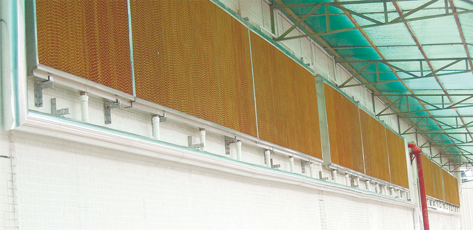 ◆主要材料介绍:水帘降温工程利用和环保空调相同的降温原理,将水帘和负压风机完美结合利用。其利用的蒸发器同样是直接蒸发式换热器“多层波纤维叠合物”水帘是瑞典的专利产品,是经特殊处理的7090型“波纹纤维纸叠合物‘,有良好的吸水性能和通风性能;耐水浸泡不变型;耐腐蚀,正常使用寿命可超过5年。由于其利用水帘面积比环保空调大,所以其降温效果要好于环保空调,可以达到4-13℃的降温幅度。和环保空调降温工程的不同点是水帘降温是针对某个完整且相对封闭的区域,且在水帘厚度方面有100mm和150mm供选择。